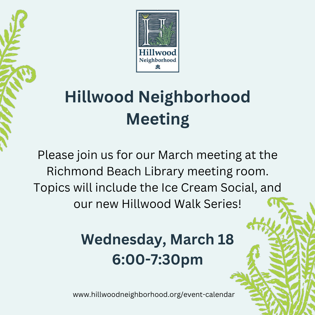 Please join us for our March Hillwood Neighborhood Meeting on March 18th from 6:00-7:30pm in the meeting room at the Richmond Beach Library.