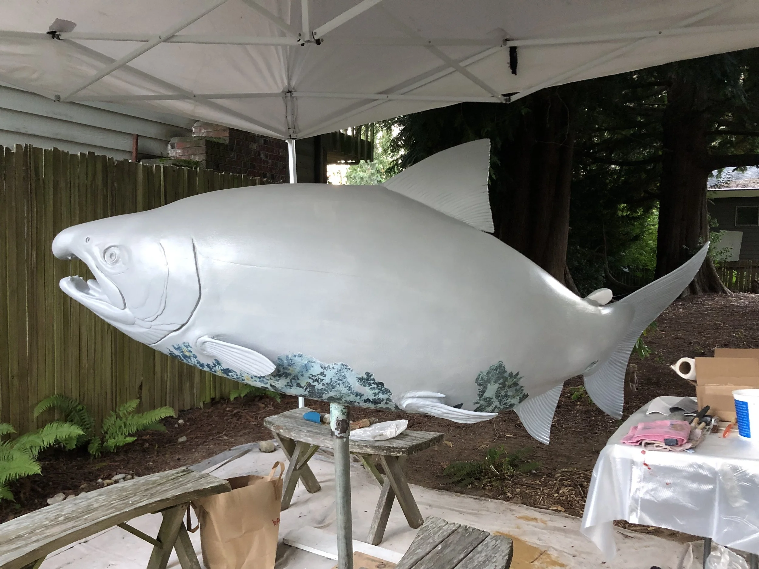 The first coats of white gesso and base paint were applied to both the salmon. Here, HNA treasurer George Downs paints a fin.